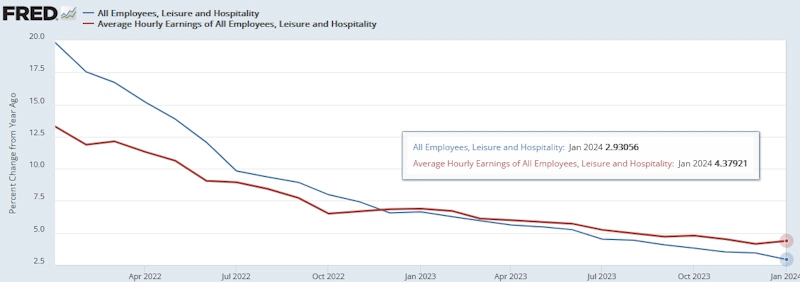 【レジャー・ホスピタリティ(雇用者数と平均時給)[前年同月比]】