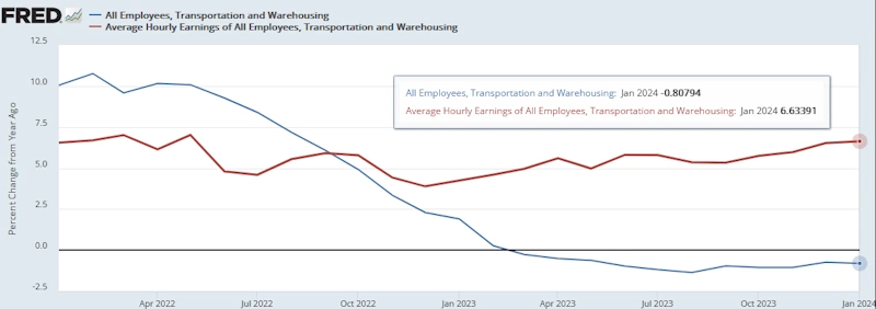 【運輸・倉庫(雇用者数と平均時給)[前年同月比]】
