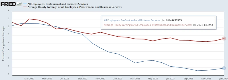 1月の雇用者数は前年同月比-1.14%と昨年2023年10月の-3.65%を底に下降トレンドから上昇トレンドへ移っています。