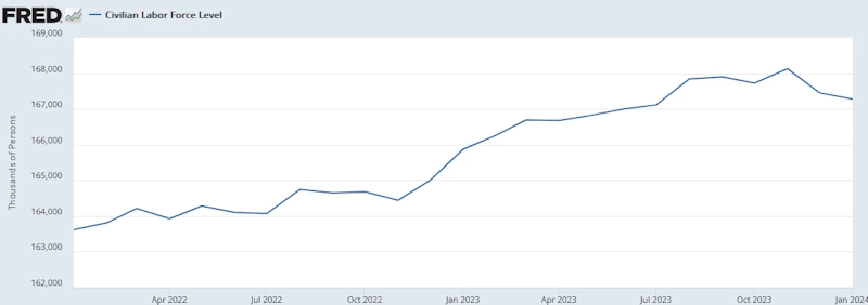 やはり、就業者と完全失業者を合計した労働力人口の絶対数が昨年2023年11月に天井を付け、ここ2か月は減少傾向となる中、労働参加率も上がってこないため、人材の供給が減り続けており、人件費の高騰を招いていると考えられます。
